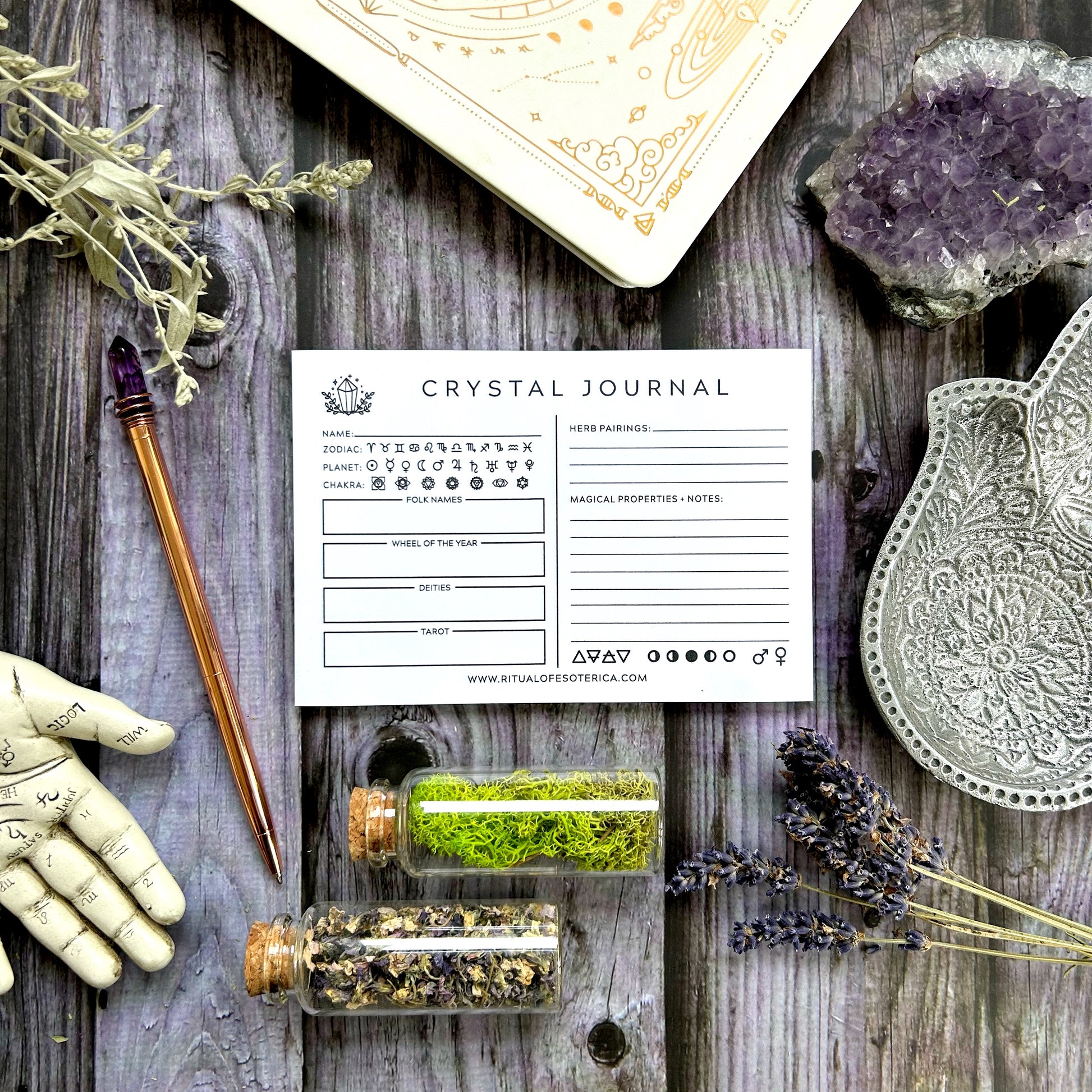 The original Crystal Journal Sticky Notepad, to complement your existing journaling practice. Designed for anyone seeking a deeper, more intentional relationship with their gemstones, the Crystal Journal Sticky Notepad is a guided journaling tool for crystal lovers, collectors, and energy workers who want a clear yet soulful way to record their experiences. With prompts to help you note a crystal’s properties, correspondences, intuitive impressions, and personal insights, and a reference card outlining common magical intentions and metaphysical properties.